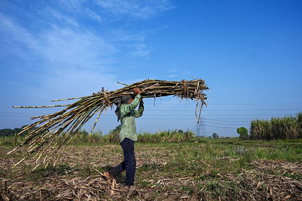 当地时间2023年4月2日,印度北方邦密鲁特市,一名工人搬运收割后的甘蔗。全球食糖供应正变得越来越紧张,主要原因是全球最大食糖进口国之一印度在降雨损害甘蔗作物后削减了出口,同时该国将更多的甜味剂用于生产生物燃料。视觉中国 资料图