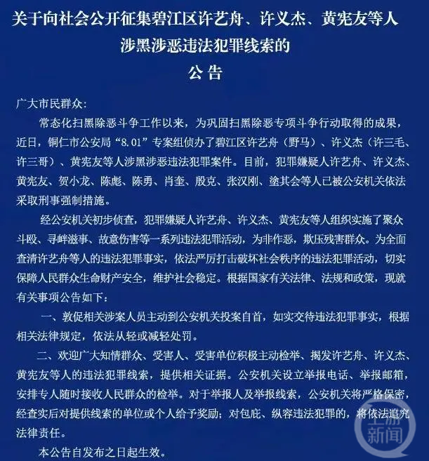 这一切在9月7日随着铜仁市公安局发布的《关于向社会公开征集碧江区许艺舟、许义杰、黄宪友等人涉黑涉恶违法犯罪线索的公告》戛然而止——经公安机关初步侦查,犯罪嫌疑人许艺舟、许义杰、黄宪友等人组织实施了聚众斗殴、寻衅滋事、故意伤害等一系列违法犯罪活动,为非作恶,欺压残害群众。