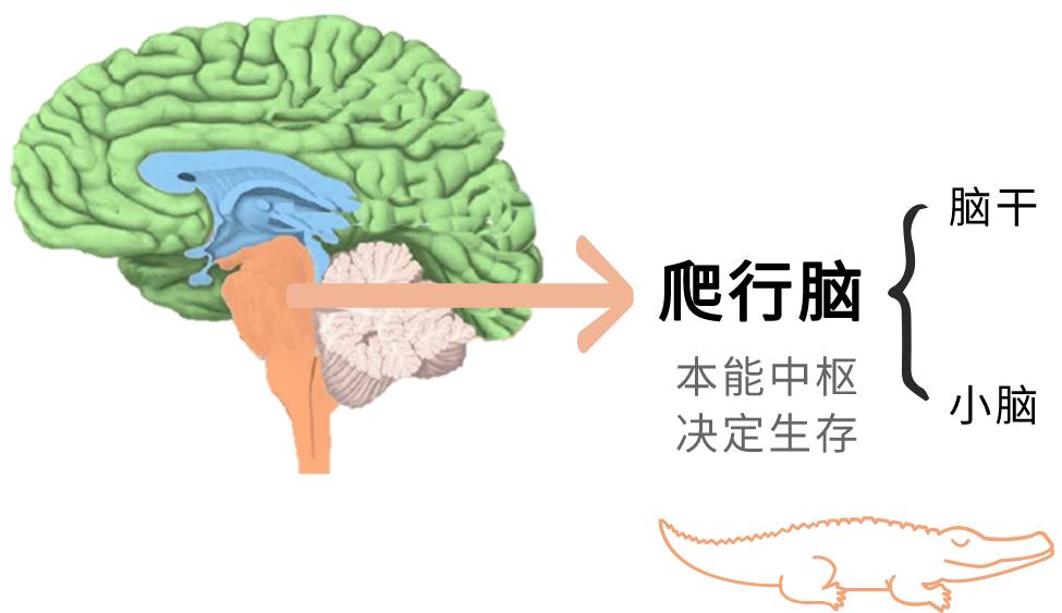 按照种系发生的时间早晚顺序,人脑又可以分为三部分,最古老的部分在爬行动物时代就已经发生,我们不妨把它称为"爬行脑"。保持平衡、协调运动的小脑就处在这个位置。脑干也处于爬行脑这一层,主要功能就是呼吸、心跳、流汗、血压、体温控制等。