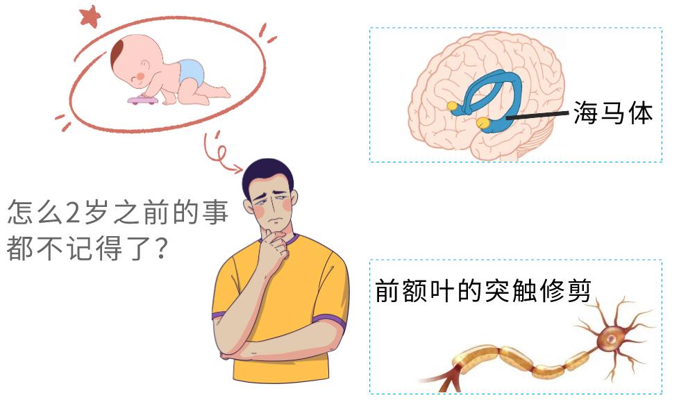 对于2岁之前记忆,大家基本都是一片空白,那是因为颞叶内负责储存记忆的海马早期没有发育成熟。还有一个重要的原因,那就是前额叶的突触修剪。