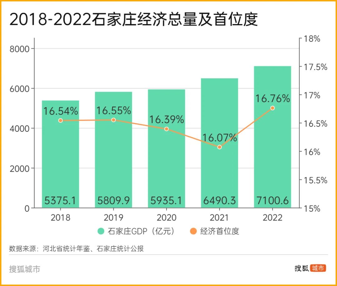 强省会核心指标除了经济总量,还有首位度。“十二五”以来,石家庄经济首位度从16.94%下降到了2021年的16.07%,直到去年才又回升至16.76%——这意味着,过去十来年石家庄没有跑赢全省平均增速;同期石家庄人口首位度虽然有所提升,但提高不到1%,提升幅度在省会城市处于尾部。