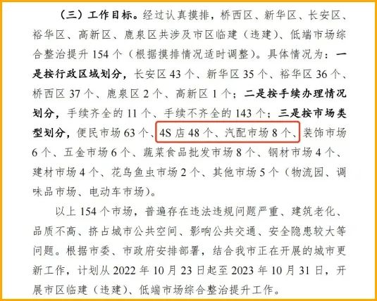 石家庄日报报道称,清除私搭乱建、违章建筑这一“绊脚石”,为城市提供了优质发展空间,“专项行动开展以来,石家庄共利用腾退土地开展项目建设和基础设施建设达800万平方米”。《关于市区临建(违建)、低端市场综合整治提升工作实施方案》则明确,10月底将完成154个市场综合整治,其中包括48家4S店、8个汽配市场及汽贸园等。