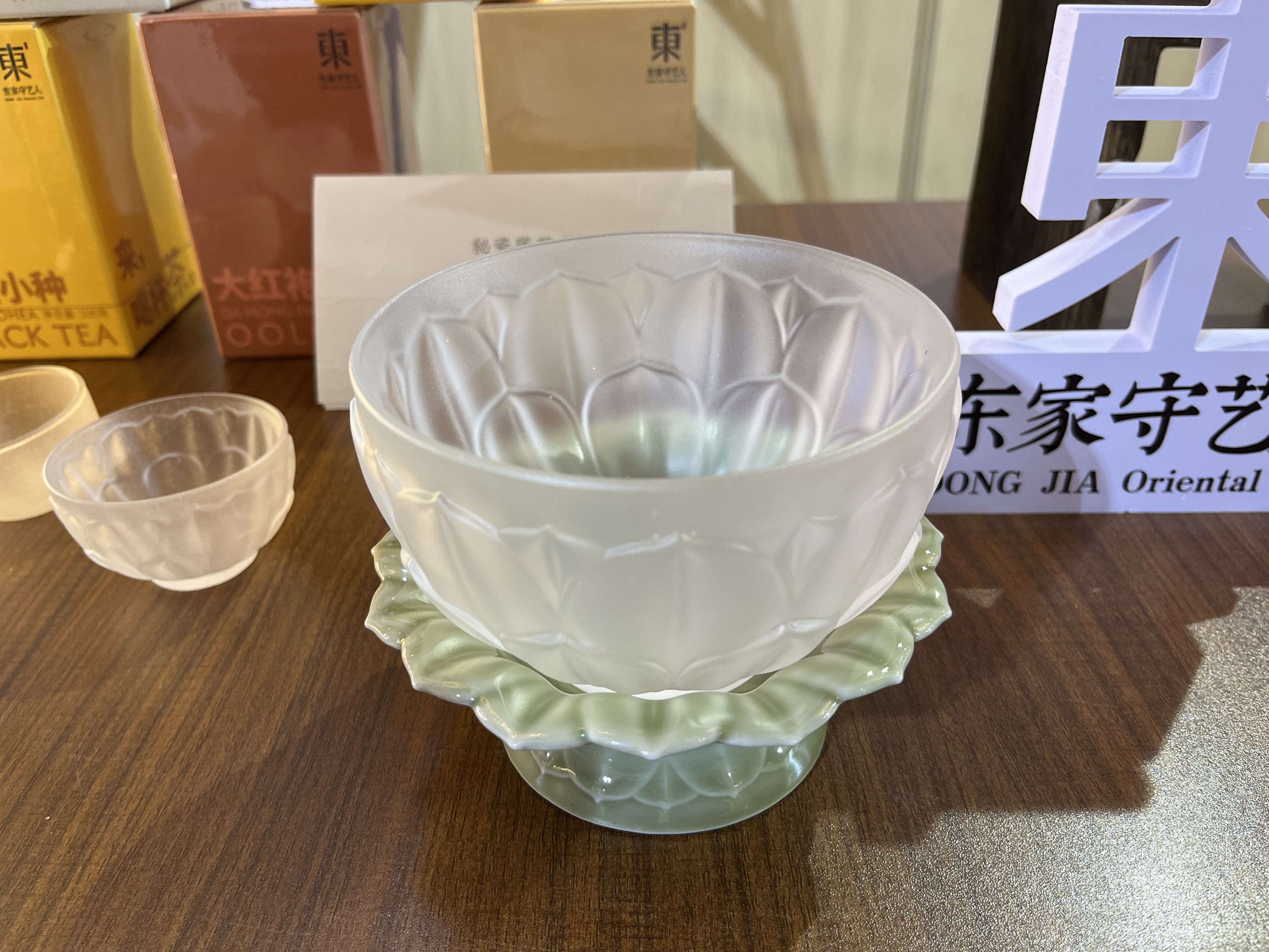 东家守艺人展示了其与苏州博物馆联名的新款设计产品秘瓷莲花盏礼盒,设计灵感取自苏州博物馆镇馆之宝五代越窑“秘色莲花碗”。
