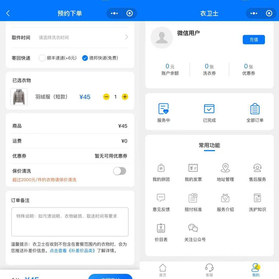 市民郭女士因看到“衣卫士”微信小程序充值有优惠,便选择了微信小程序下单,结果,4月17日衣服寄出后,就没了消息,“客服说衣服弄丢了,跟我商量赔偿方案,说是只能赔偿洗衣费的10倍外加原来的洗衣费,并退回充值的300元,共计1485元,可我的衣服原价要9000多元。”因赔偿金额无法达成一致,双方就此僵持不下。让郭女士颇为生气的是,在平台下单时,没有任何保价的提醒和丢失、洗坏的赔偿说明,也没有签订服务合同。