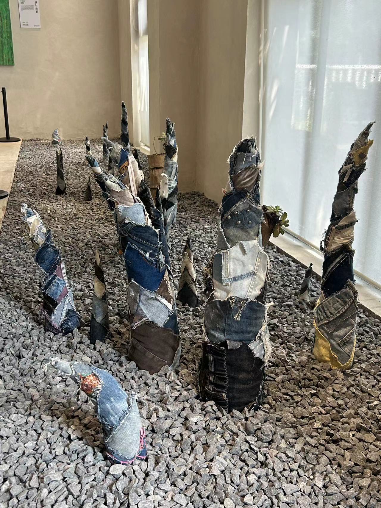 第三次来龙游的浙江师范大学“双龙”学者特聘教授王雷因为这里的山水人文有了灵感,和团队一起创作了具有当地特色的作品。其中一件作品《共生》是用当地人的旧衣服,做成各种形态的笋,表达出龙游当地人的精神里力争上游、欣欣向荣的态势。