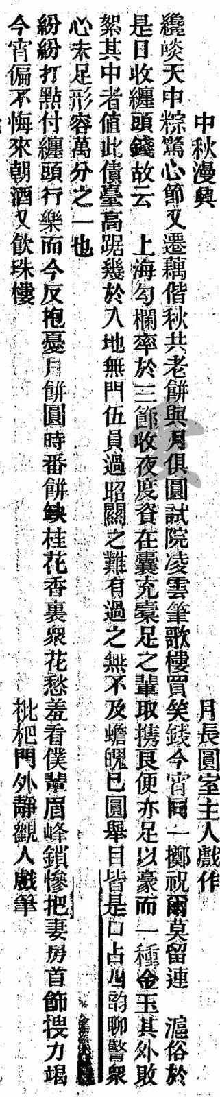 1873年10月6日,《申报》中有一篇名为“中秋漫兴”的小文,作者自号“月长圆室主人”,落款“枇杷门外静观人戏笔”。文中有这样一句颇有意境的描写:“月饼圆时番饼缺 桂花香里众花愁” ,不知在佳节中,作者因何感叹?