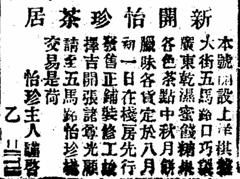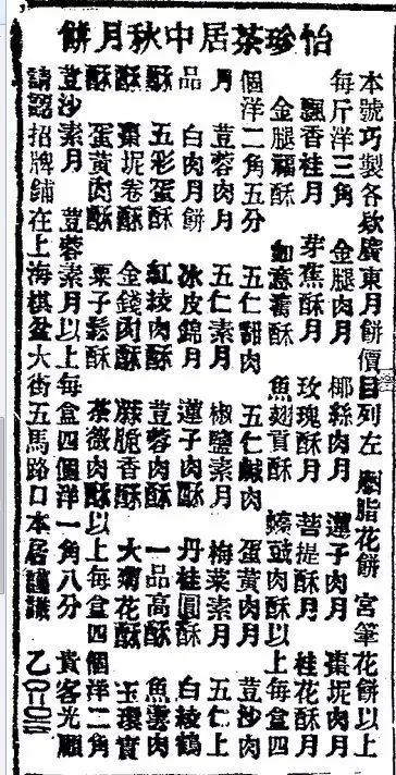 19世纪后期,随着上海城市规模的不断发展,人口聚集,商市繁荣。许多日常食品制造商,为了抢占、扩大的市场,开始增加投入,开启规模化生产及市场营销。《申报》上也时常出现与月饼有关的广告。1887年9月18日,五马路(广东路)新开怡珍茶居,其经营特色中就有“月饼”一项。而1888年9月3日,该商号的广告中明确出现了“广东月饼”这一名词,而且可见其品种繁多,口味各异。