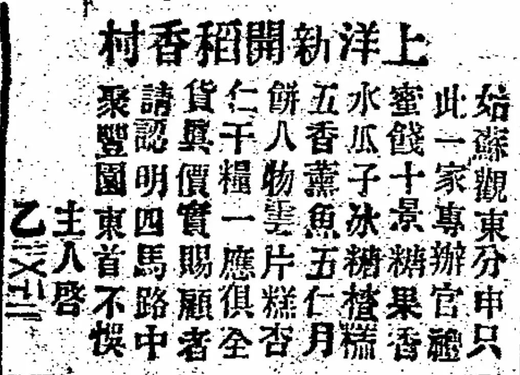 1900年7月20日,《申报》刊登的上洋新开稻香村广告,其中特别提到“五仁月饼”。“上洋”为上海的别称,在清末和民国早期很常用。文中还特别强调“姑苏观东分申 只此一家”而月饼第一品牌“杏花楼”的出现最早可见于1879年6月4日的一则捐资启事,其店名的正式启用则见于1883年9月28日的一则启事。