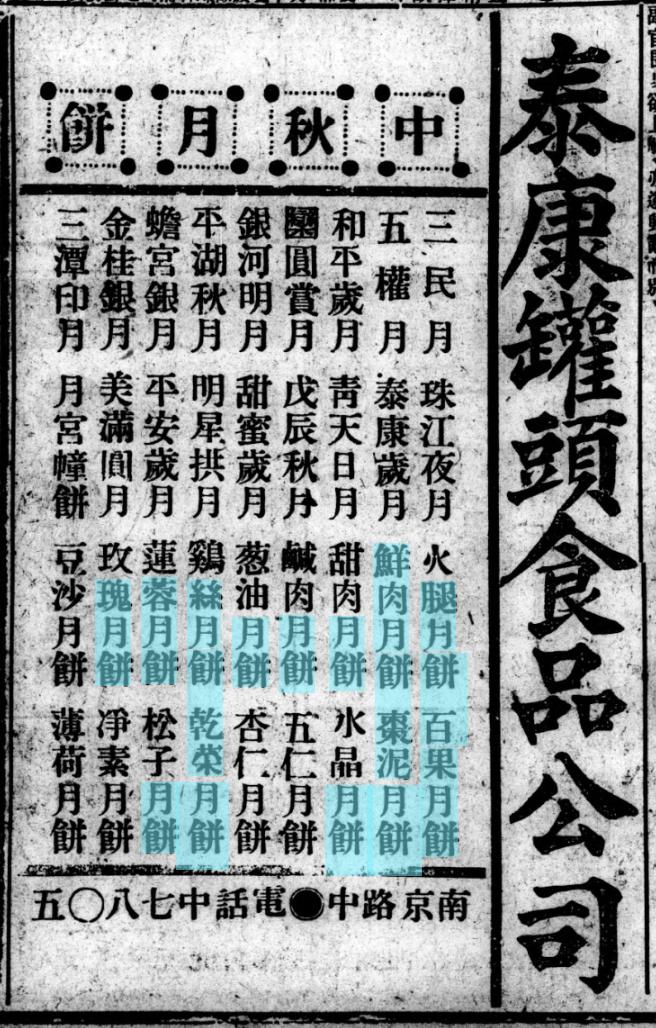 1928年9月10日 《时事新报》泰康食品公司月饼广告,其中可见“鲜肉月饼”