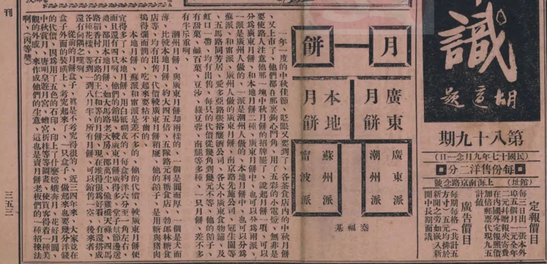上海出版的《常识》杂志1928 年第1卷第89期头版就有一篇关于月饼种类的文章,内容颇为详细。其中将月饼分为“广式”“本地”两大类,而其中又细分“广东派”“潮州派”“苏州派”“宁波派”。