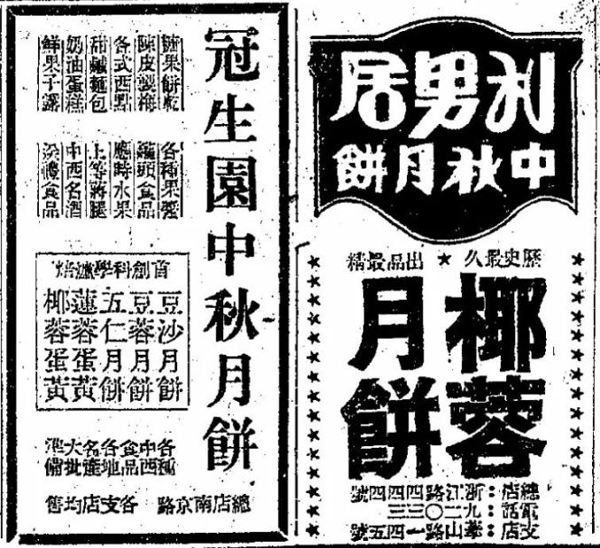 1946年9月2日,《申报》 刊登的冠生园和利男居月饼广告