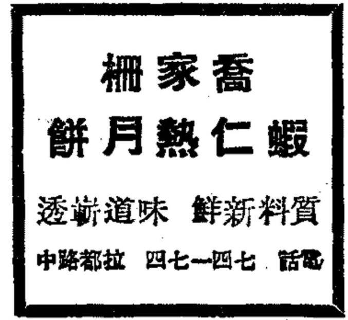 1948年8月28日,《申报》 刊登的乔家栅虾仁热月饼广告