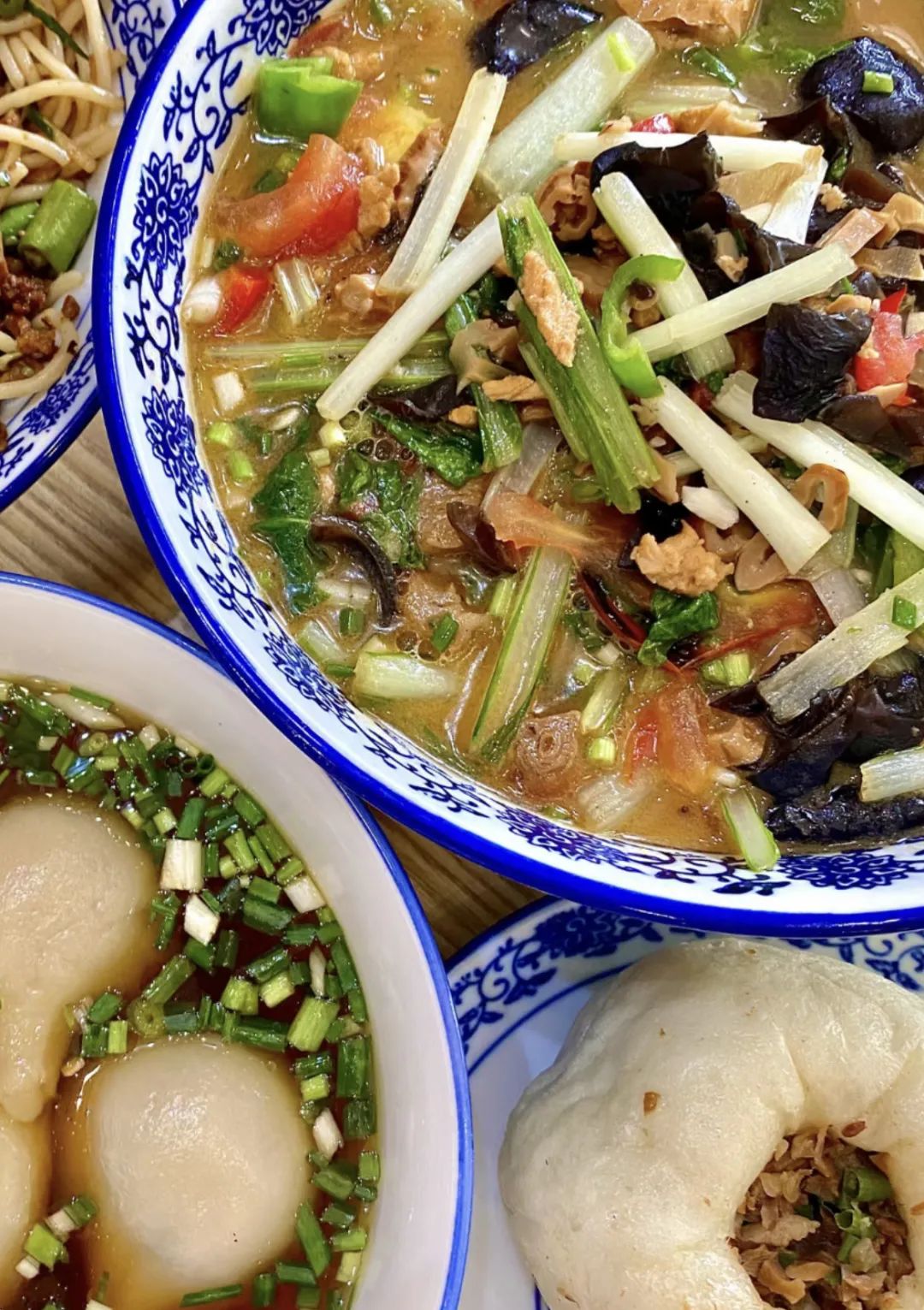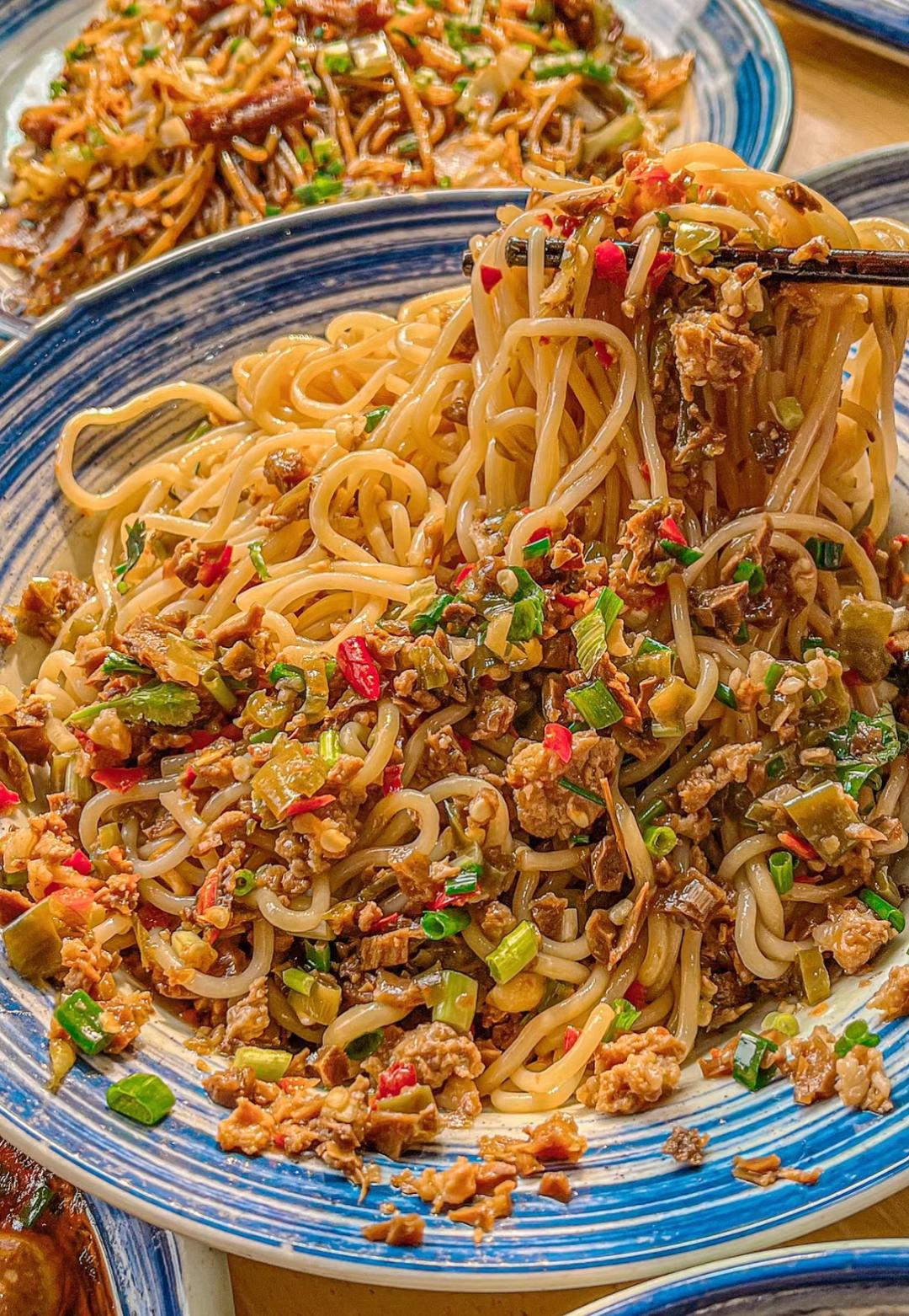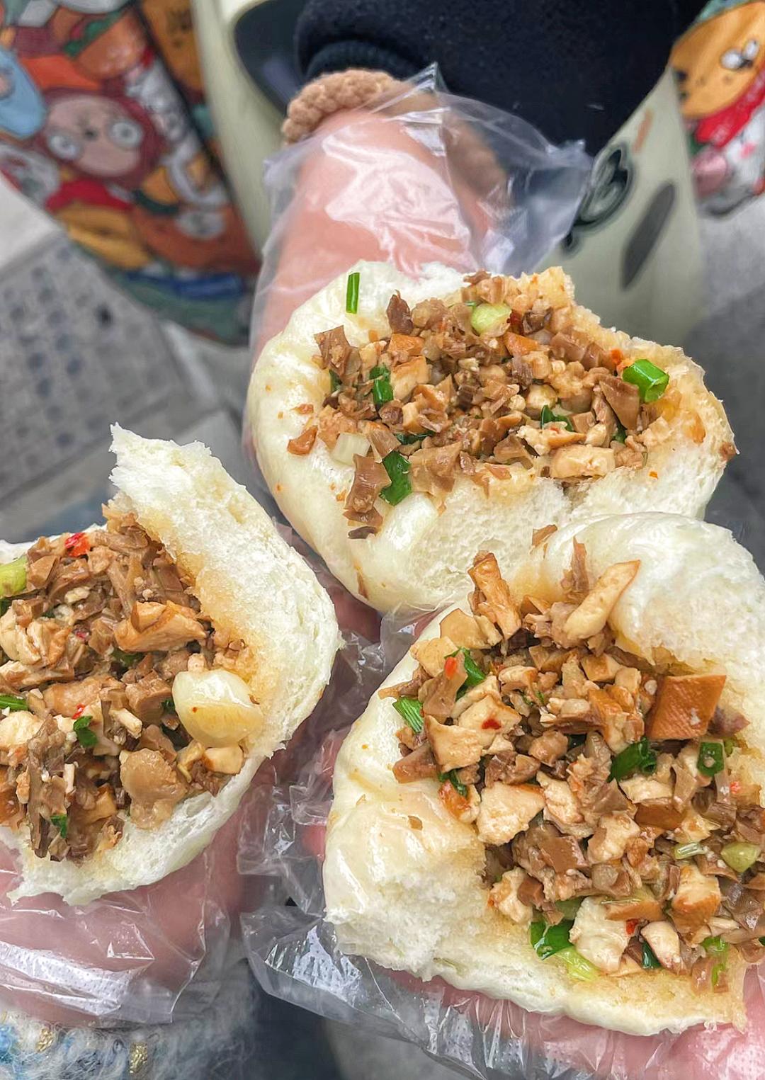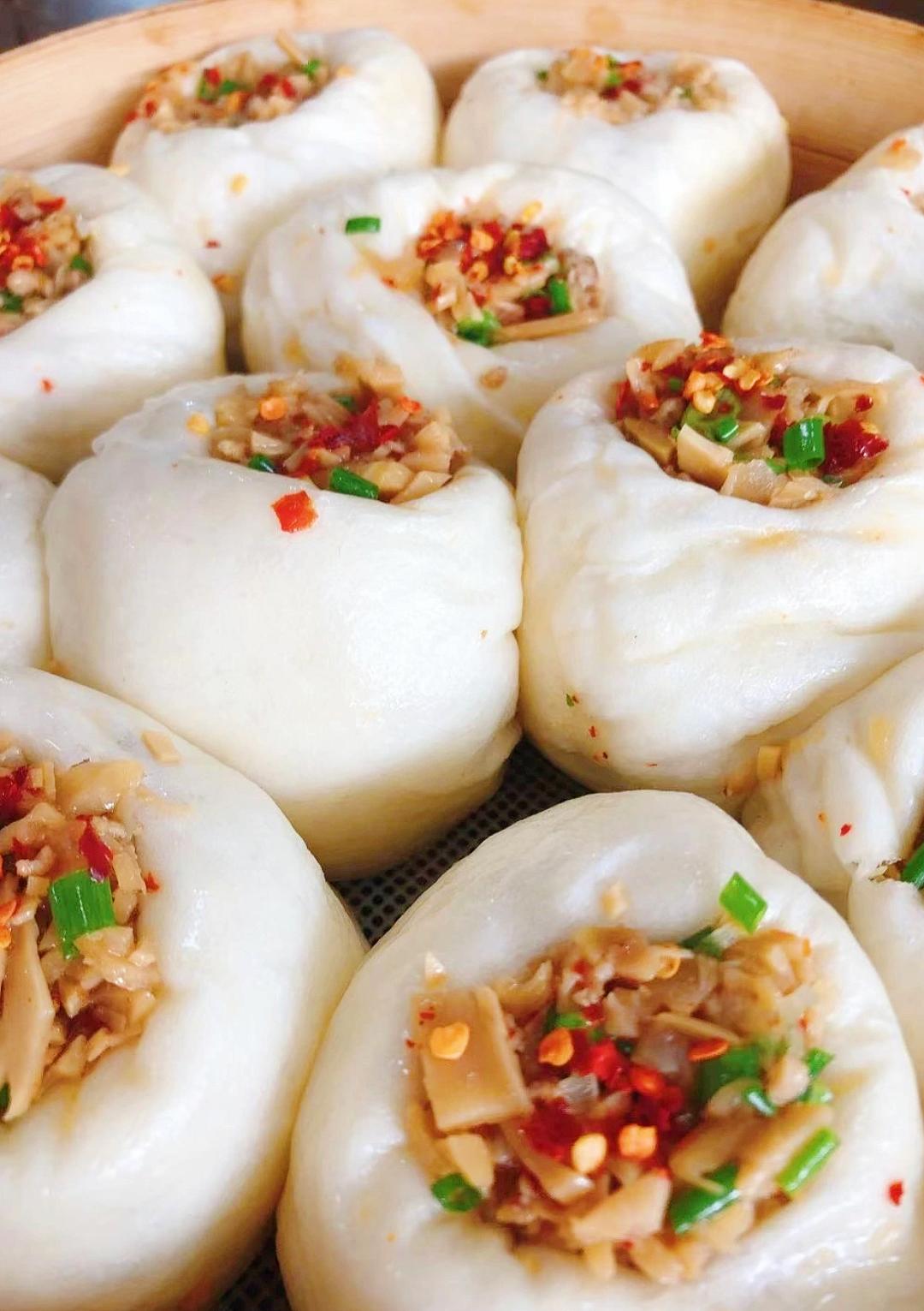 他家做的葱花馒头,松软的面皮包裹着辣辣的笋干和肉沫,吃起来爽口得很,而且他家的炒粉干也是绝绝子。
