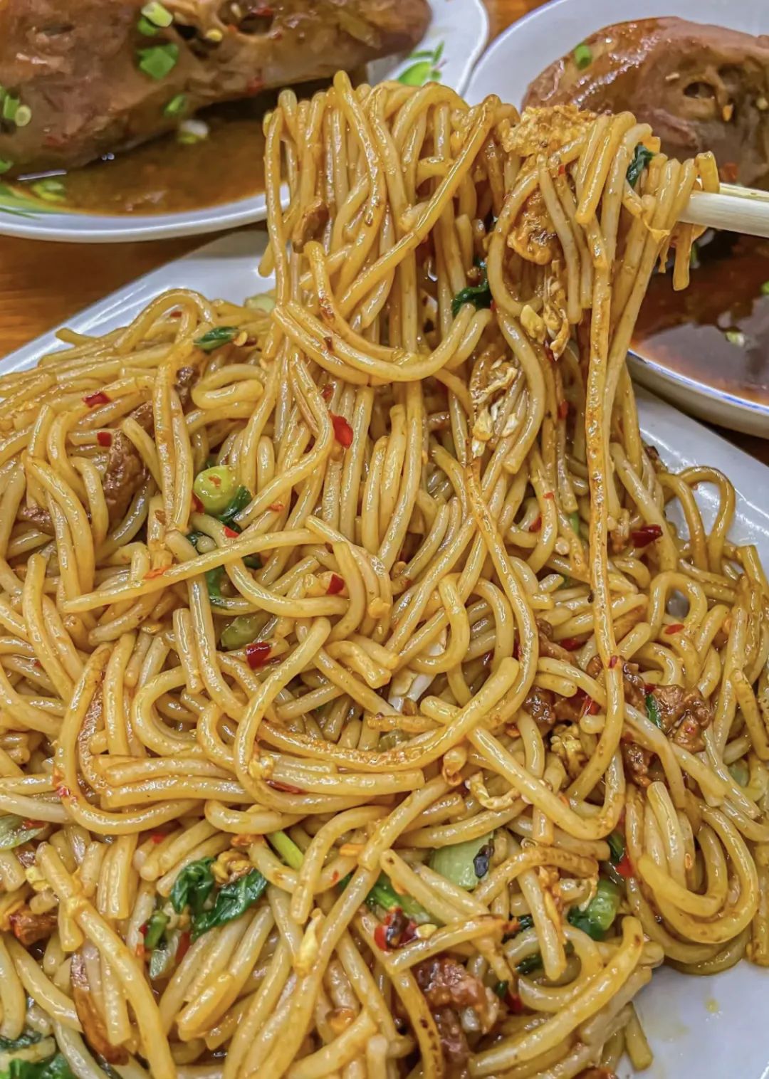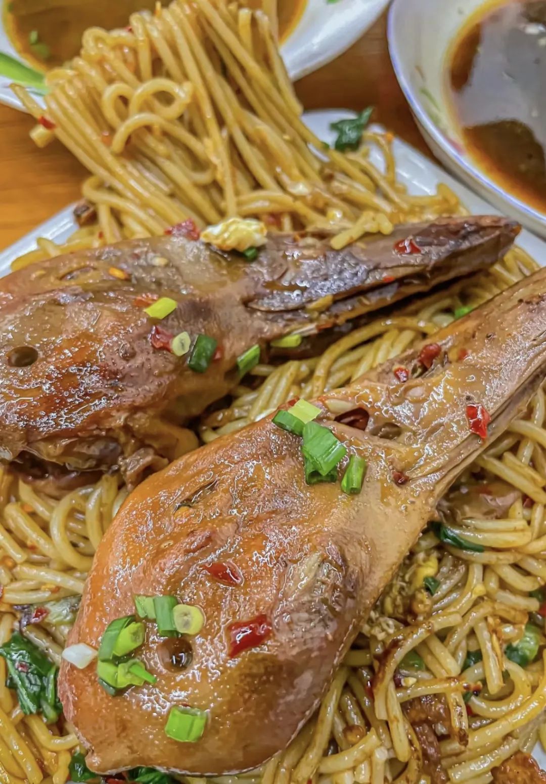 ©️大檬大檬粉干都是手工做的,保证了入口的爽滑柔韧,炒的时候再加酸豆角花生凉拌,最后用辣椒收尾。当然,“最当地的吃法”当是把鸭头的卤汤倒进粉干里,一口唆进嘴里,香辣味就在口腔中不断缠绵,让人瞬间上头,