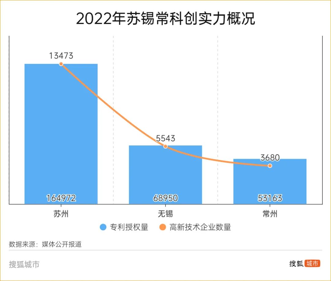 与工业体量类似,苏锡常科创实力也是苏州独大,锡常处于弱势,创新企业和平台资源主要集中在苏州。以高新技术企业为例,截至去年,苏锡常分别有13473家、5543家、3680家。创新力方面,苏锡常2022年的专利授权量分别为164972件、68950件和53163件。
