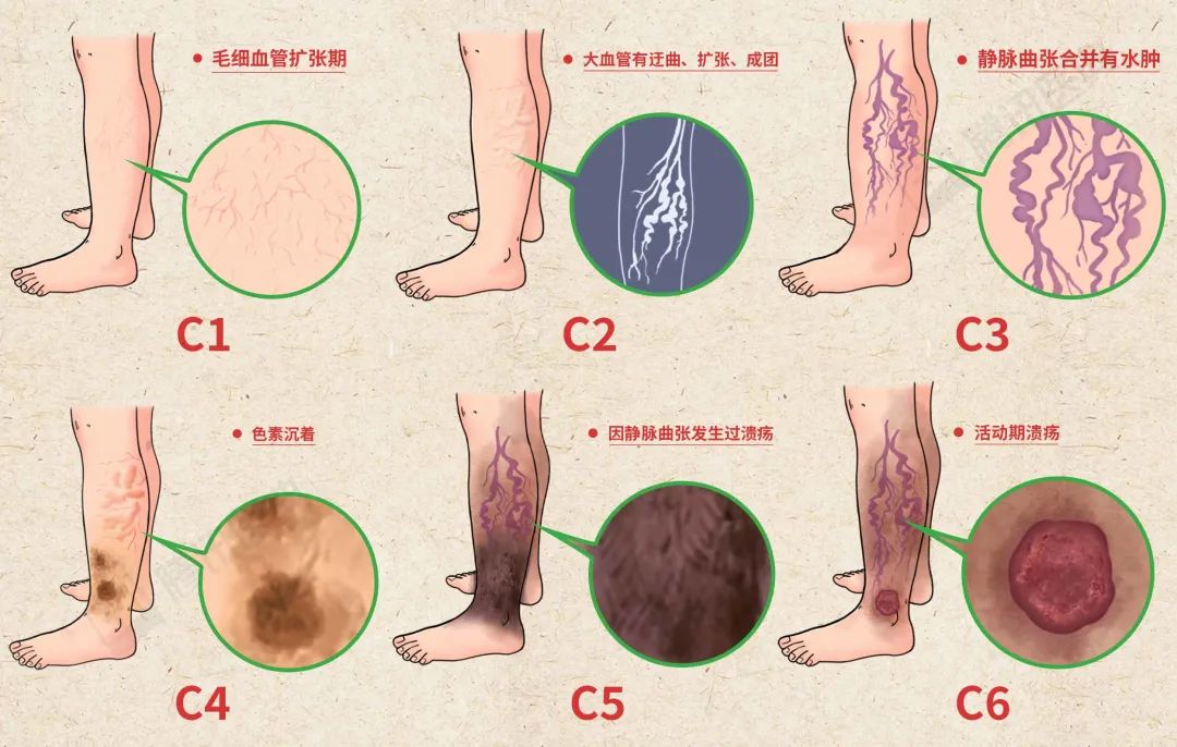 C1:腿上毛细血管扩张期,主要的表现是皮肤上出现细小的血纹、血丝。C2:大血管有迂曲、扩张、成团,也就是临床说的静脉曲张。这时可能无症状,也可能伴有小腿酸胀、易疲劳等不适感。