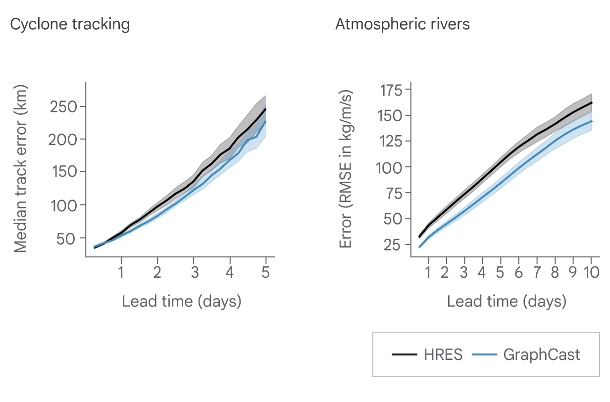 谷歌DeepMind的分析还表明,GraphCast可以提供极端天气事件的早期预警,准确预测未来的气旋轨迹,识别与洪水风险相关的大气河流,并预测极端气温的出现,这种能力有可能通过加强准备来拯救生命。