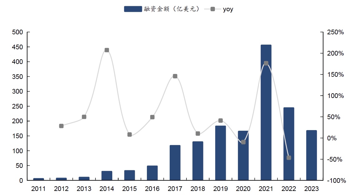 美国AI领域规上融资规模(2011-2023)。来源:Crunchbase、国信证券资料整理;仅统计500万美元以上投资项目。