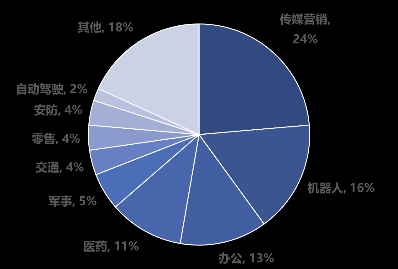 首先,应用的落地数量跑赢大盘。根据统计,在海外落地的AGI模型应用中,55个成规模的落地应用中,营销相关类应用占据24%,为所有行业中比例最高。