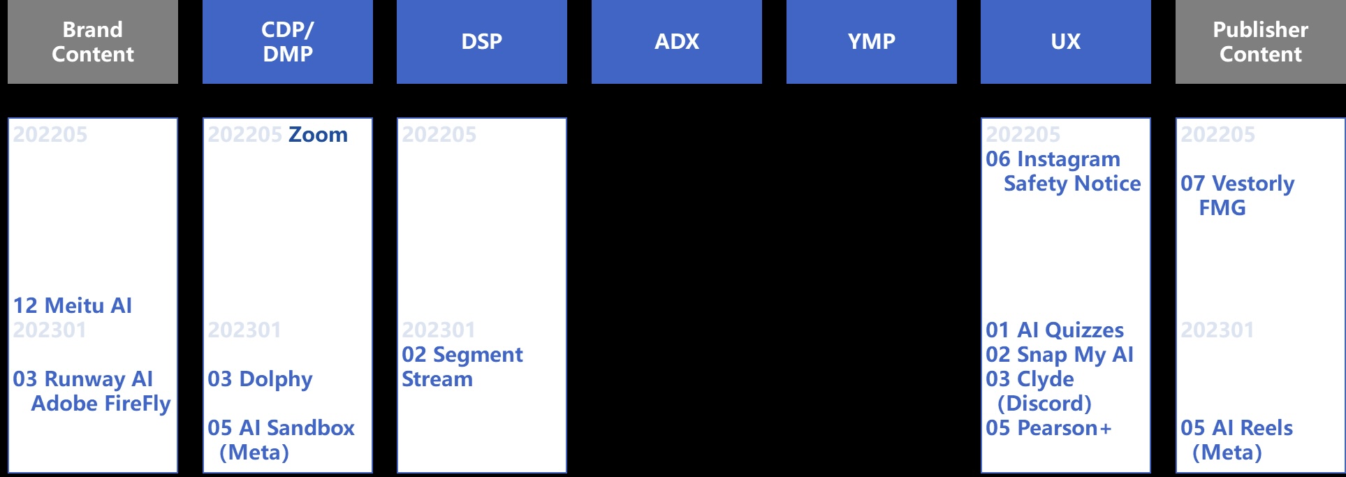 3.上一阶段营销界对于AI技术的应用主要集中在内容层面,可能因为这是一直以来营销业提升生产效率的痛点,AI(尤其是AGI)的成熟能立竿见影地提升这一环节的投资回报率;