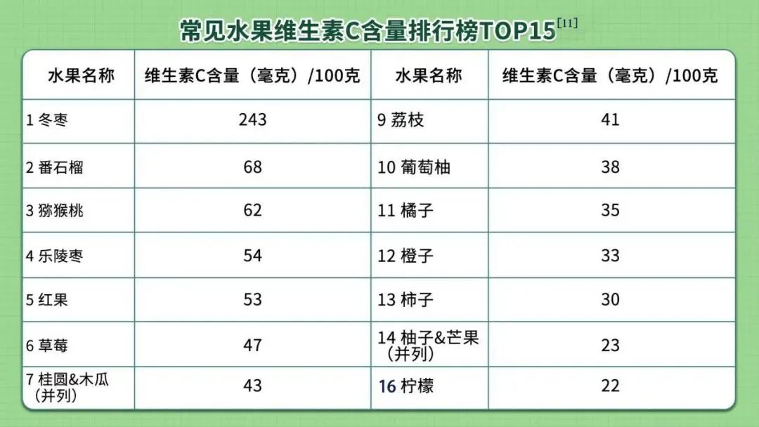 不是越酸的水果,维生素C就越多。看看下面这张表就知道,冬枣、石榴、草莓等维生素C含量都不低,你们心目中的橙子、柠檬,都排到了10名之后。