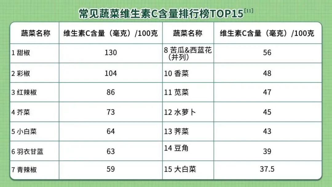 彩椒、西蓝花、小白菜等都是维生素C含量的高手。就连大白菜都完胜西红柿(西红柿的维生素C含量是14毫克/100克),想不到吧?