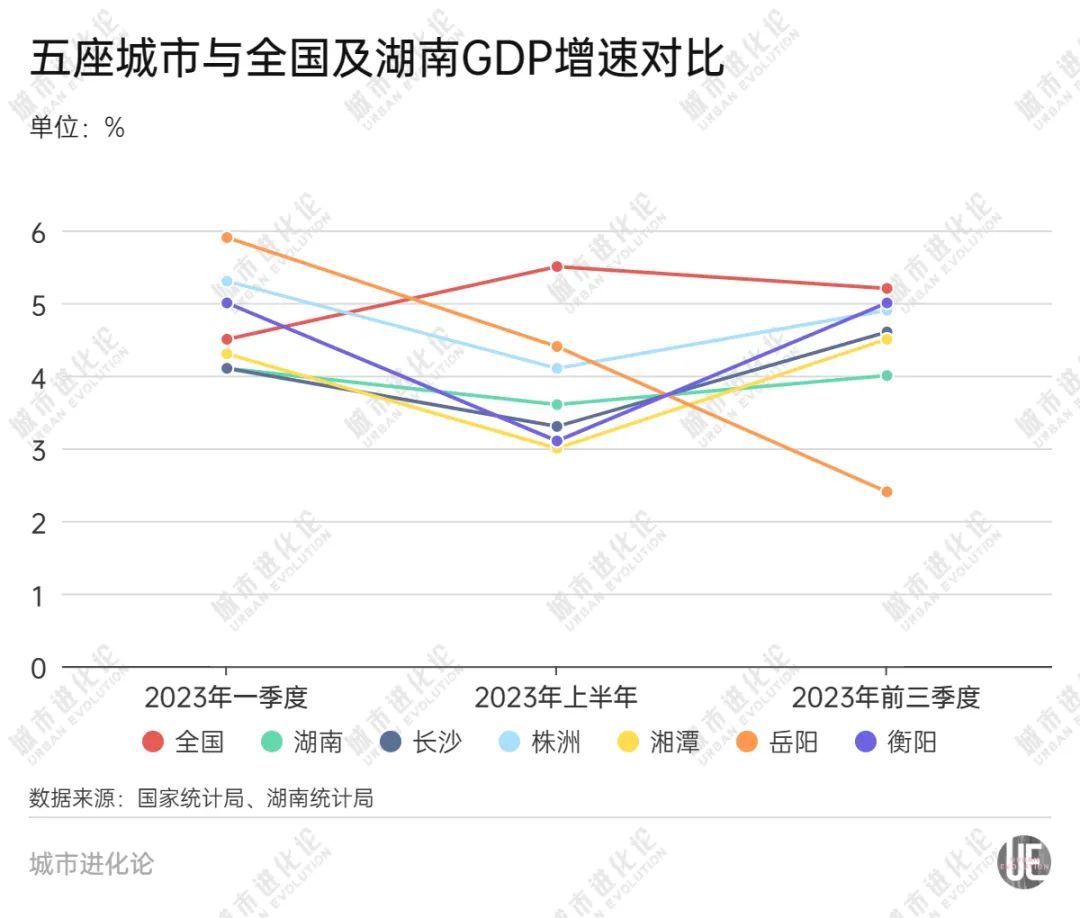 相比之下,岳阳、衡阳的经济增速表现还算亮眼,第一季度双双高于全省、全国水平,前三季度衡阳5%的增速更加接近全国水平,在全省范围内表现靠前。
