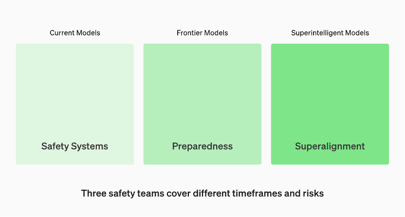·生产中的模型由“安全系统”团队管理。开发中的前沿模型有“准备”团队,该团队会在模型发布之前识别和量化风险。然后是“超级对齐”团队,他们正在研究“超级智能”模型的理论指南。