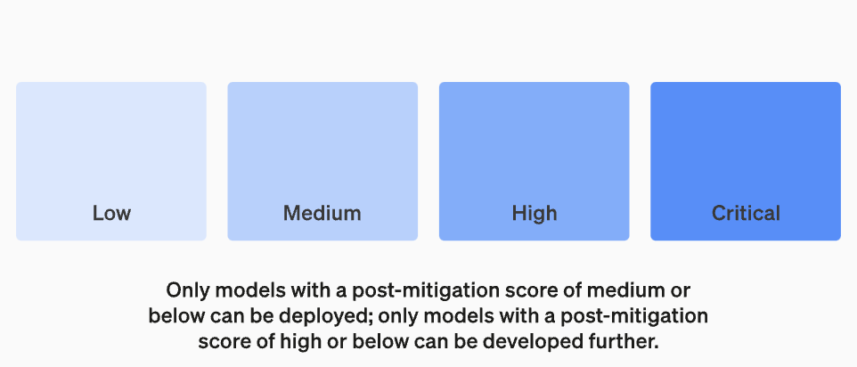 OpenAI假定了各种缓解措施:例如,模型对于描述制作凝固汽油或管式炸弹的过程保持合理的保留态度。在考虑已知的缓解措施后,如果一个模型仍然被评估为具有“高”风险,它将无法部署,如果一个模型存在任何“关键”风险,将不会进一步开发。