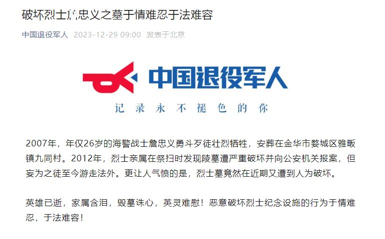 2023年12月29日,“中国退役军人”微信号发布文章《破坏烈士詹忠义之墓于情难忍于法难容》称,恶意破坏烈士纪念设施的行为于情难忍,于法难容!