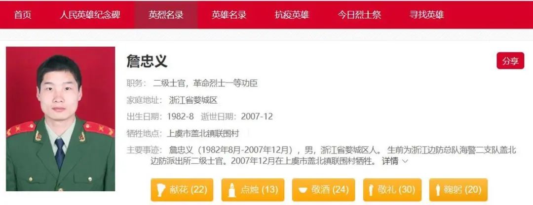中华英烈网上的詹忠义事迹