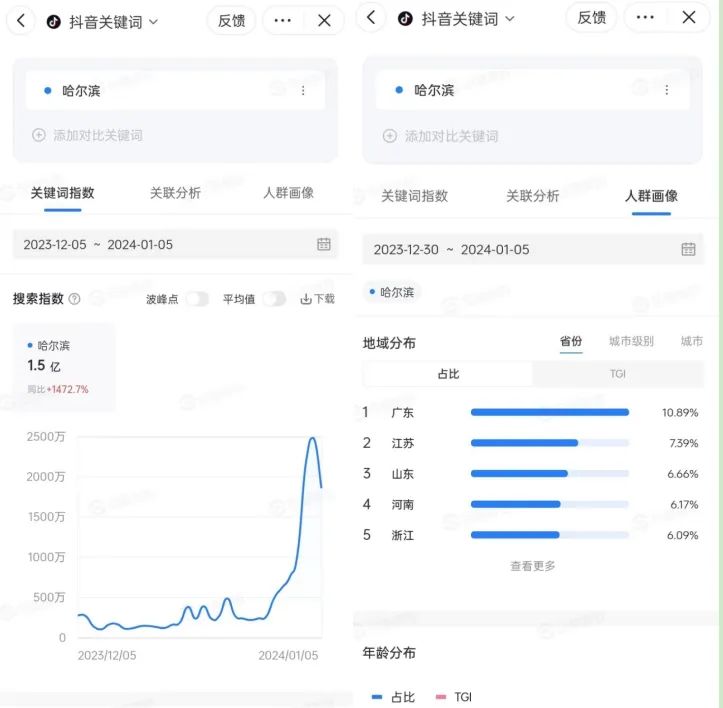 首先,先看百度指数,作为最热门的搜索指数,百度指数可以明显看到当前的市场的变化趋势。之前哈尔滨的搜索数据一直比较平稳,12月18日有一个小高峰,正是我们之前提到的冰雪大世界事件,之后如同之前一样恢复平稳。然而,从12月30日开始一路高歌猛进,形成了星火燎原之势,迅速快速兴起,可见这个趋势和我们之前分析淄博的时候有异曲同工的感觉。