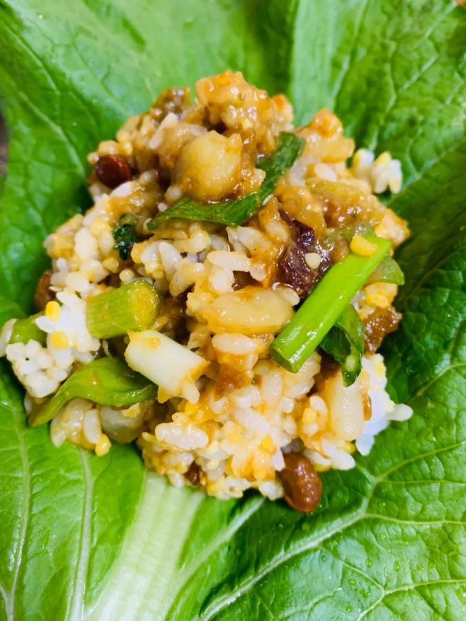 米饭+土豆泥+鸡蛋酱+葱花香菜,其他配料可以让老板再加,最外面用生菜包叶上,一整口吃下去都是满满的幸福。