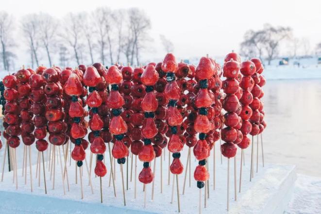 冻梨 丨图片来自图虫创意冰糖葫芦肯定是少不了的,冬天的糖葫芦被北风冻得邦邦硬,外面的糖壳甜脆,里面的水果甚至有类似沙冰的口感。总之,北方的冰糖葫芦真的和南方的完全不一样!☛