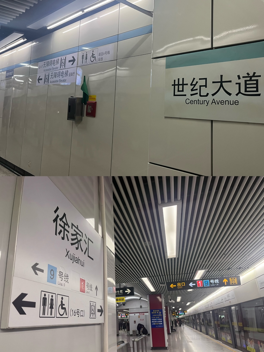 徐家汇、世纪大道等站点在这一方面做得明显清晰了不少,无论哪条地铁线路,都在站台内标注了卫生间所在的位置。如徐家汇的地铁线路都有“卫生间、无障碍通道(16号口)”的标识,且沿途的墙上也有箭头等相关指引,而世纪大道则以白底黑字标注着“卫生间、无障碍通道请至6号线站台”。