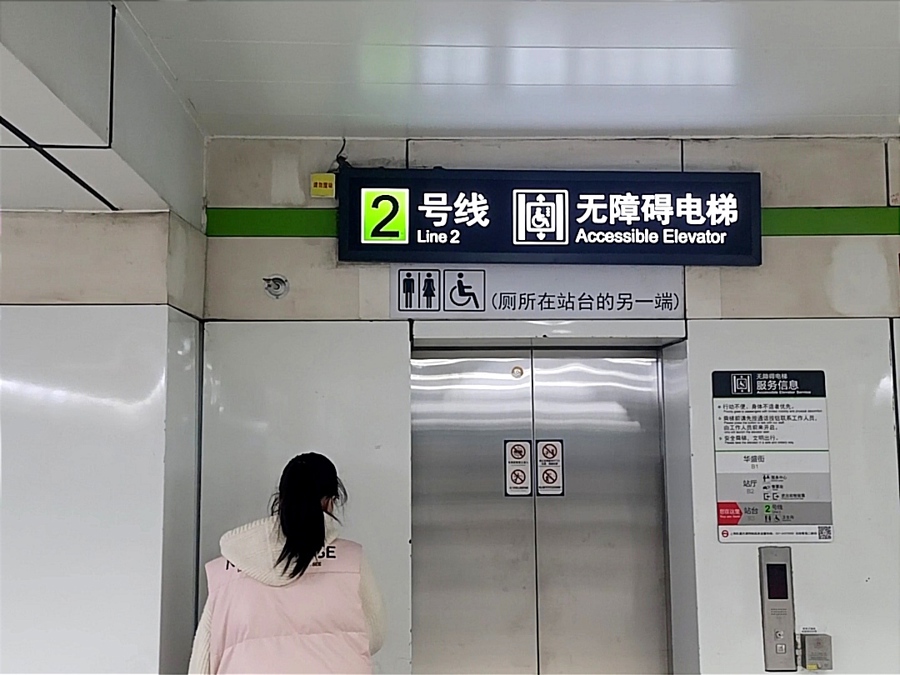 例如1号线、2号线、8号线交会的人民广场地铁站,乘客抬头即可看到发光的悬挂指示灯牌,标记着出口方向和卫生间方向。在人民广场地铁站的2号线站台内,除了发光的指示灯牌外,还能看到无障碍电梯旁贴着“厕所在站台的另一侧”的标识。