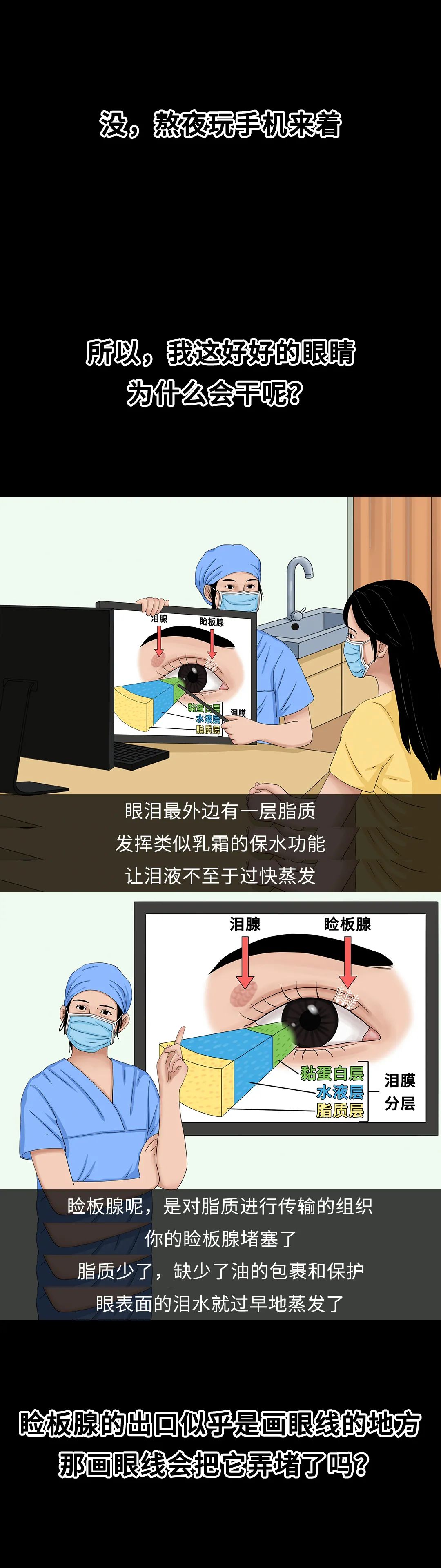 长期过度用眼和眨眼太少导致泪液过度蒸发,也会让睑板腺悄悄发炎,影响睑板腺功能。最好每看 20 分钟屏幕就远眺休息 20 秒。