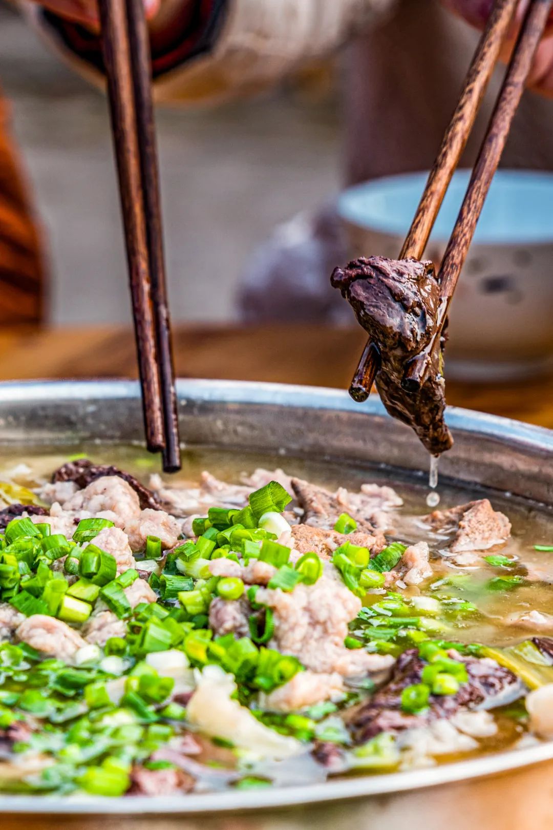贵州有些苗族,跟川渝人一样喜欢吃“剖汤”,吃到中途还会来劝酒唱苗歌,十分热闹。侗族也吃“剖汤”,但更爱“洗澡肉”,将大块的肥膘切成片,然后直接放到开水中涮,肉片熟后蘸盐和糊辣椒吃,贵州山里的肉好,简单做法更显美味。除此之外,还有苗族“腌胙肉”、布依族的“腌骨头”、彝族的 “坨坨肉”,都是贵州少数民族对年猪的想象力。