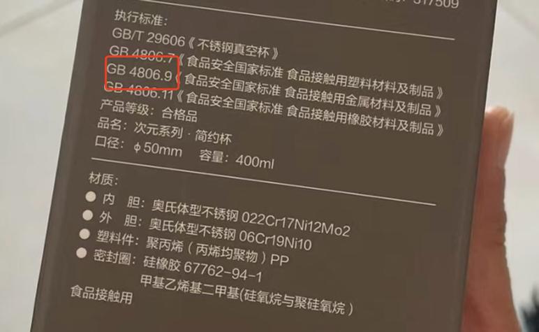 2. 不管广告上标的是304,还是316,直接看产品标签上的执行标准,显示的是GB 4806.9是合规的。GB4806.9为《食品安全国家标准食品接触用金属材料及制品》。[2]