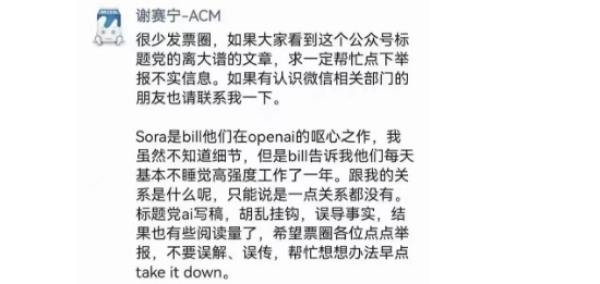Sora是Bill(Bill Peebles 又名William Peebles,Bill系昵称)他们在OpenAI的呕心之作,我虽然不知道细节,但是Bill告诉我他们每天基本不睡觉,高强度工作了一年。跟我的关系是什么呢,只能说是一点关系都没有。标题党AI写稿,胡乱挂钩,误导事实,结果也有些阅读量了,希望票圈各位点点举报,不要误解、误传,帮忙想想办法早点take it down。