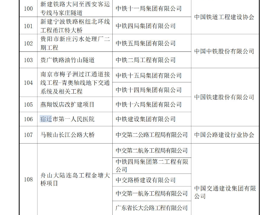 记者查阅了中国建筑业官网,在“2016~2017年度第一批中国建设工程鲁班奖(国家优质工程)复查工程名单”中有129项工程,宿迁市第一人民医院在序号106上,申报单位是中铁建设集团有限公司,推荐单位是中国铁建股份有限公司。