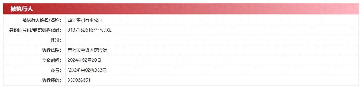 据中国执行信息公开网消息,西王集团有限公司(以下简称“西王集团”)、西王国际贸易(青岛)有限公司、王勇、王棣、王伟2月20日被青岛市中级人民法院执行超3.3亿,案号为(2024)鲁02执383号。