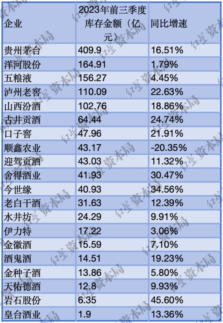 红星资本局根据2023年三季度末20余家酒企数据,发布2024上市酒企库存排行榜。