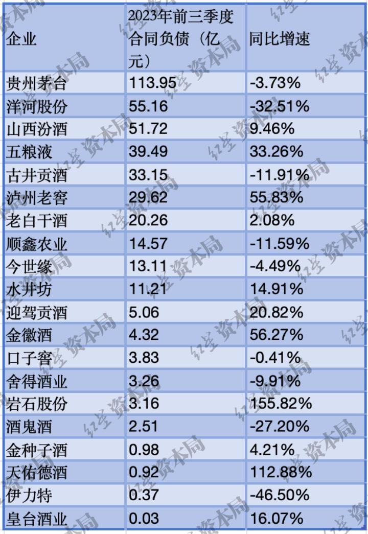 财报显示,2023年前三季度,从合同负债的金额来看,贵州茅台合同负债金额最高,达到113.95亿元,不过同比有所下滑。