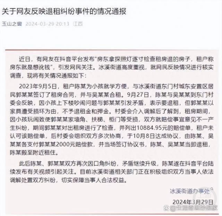 当地街道办3月29日通报中称,2023年9月,陈某(当事人陈女士)到东门村委会反映,因小孩上下楼吵闹问题,与房东郭某某引发矛盾,表示要退租,但郭某某以家具遭受损坏为由,不予退还租金和押金。