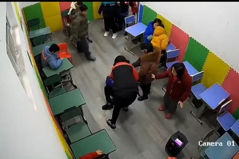举报者提供的监控视频显示,至少有两名老师对多名孩子动手。其中两段视频都是一名小孩去撕打另一名小孩,被老师拉开后打骂。另外两段视频中,一名老师手持短棒对坐在凳子上的小孩进行敲打。