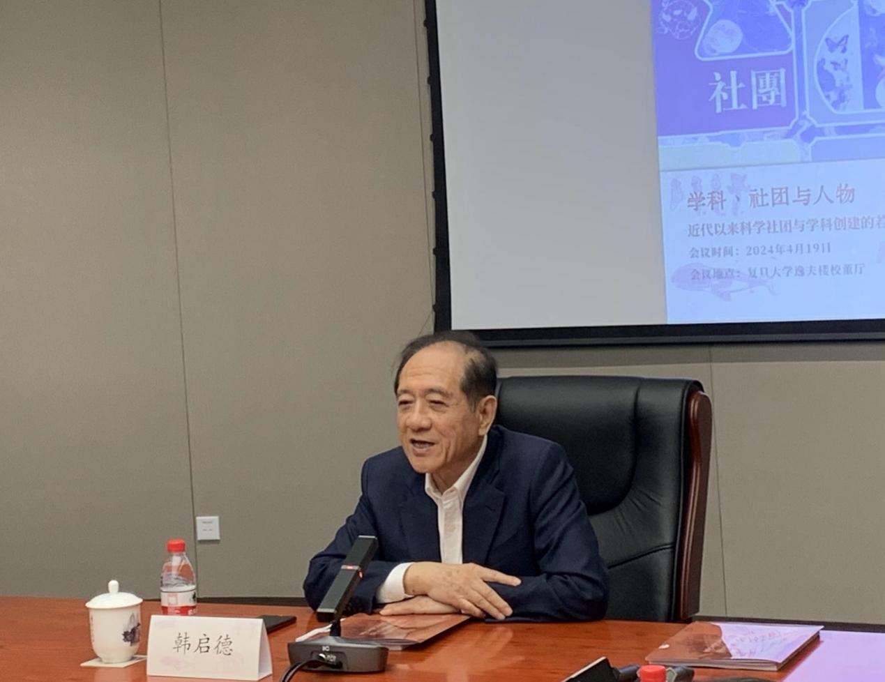 2024年4月19日,复旦大学历史学系主办召开“学科、社团与人物:近代以来科学社团与学科创建的若干问题”研讨会,中国科学院院士、中国科学技术协会名誉主席韩启德教授莅临会议,并就如何理解展开医学史研究,以及书写历史上的科学家等学术问题作了大会发言。会议召集人,复旦大学历史学系高晞教授表示,此次会议旨在于进一步推动有关近代中国科学学科、科学人物与科学社团的历史研究,增进关注不同科学学科研究学者间的交流对话,以期较为全面地理解近代西方科学和医学知识体系在中国演进的本相。本次研讨会关注近代中国诸学科的接受、草创及其地方性社团展开,殊途同归,近代科学学科正是通过不同渠道、按不同方式,以知识代理、科学社团与人际网络为推展,构成中国近代以来的旧学科与新学科的转接节点,由此,两个维度的交叠就构成了本次看似“松散”讨论的题眼所在。