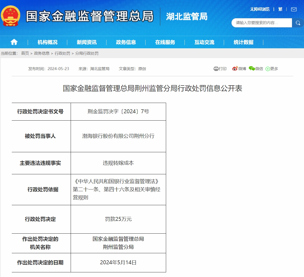 因违规转嫁成本等行为,渤海银行荆州分行、农业银行荆州被罚款