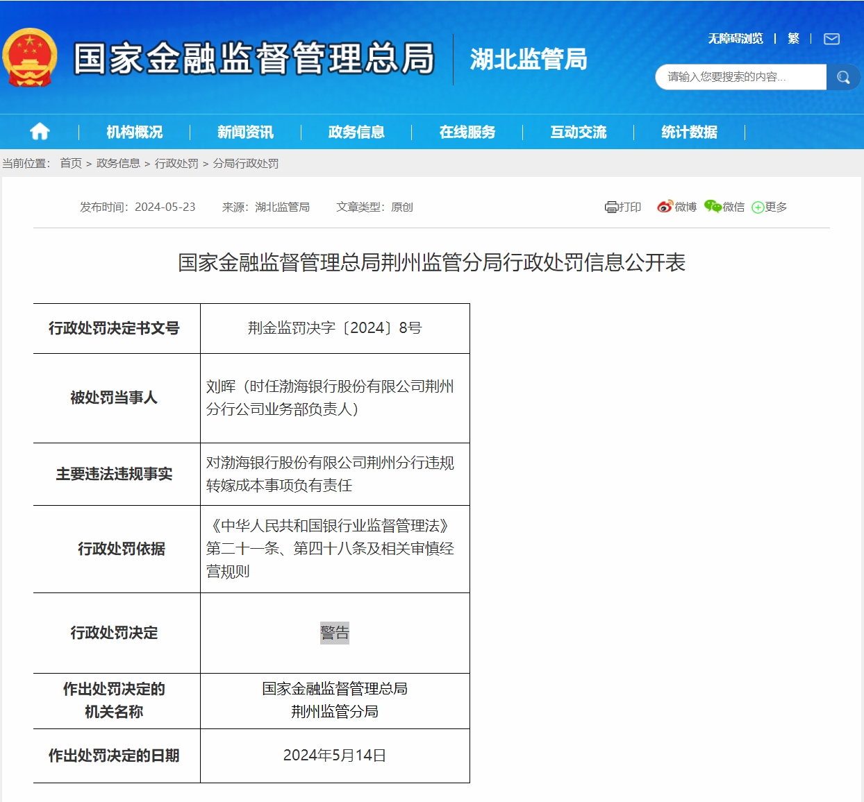 根据国家金融监督管理总局荆州监管分局发布的“荆金监罚决字〔2024〕7号”行政处罚决定书,渤海银行股份有限公司荆州分行因违规转嫁成本,依据《中华人民共和国银行业监督管理法》第二十一条、第四十六条及相关审慎经营规则,被处以罚款25万元的行政处罚。同时,根据“荆金监罚决字〔2024〕8号”,时任渤海银行股份有限公司荆州分行公司业务部负责人的刘晖,对渤海银行股份有限公司荆州分行违规转嫁成本事项负有责任,依据《中华人民共和国银行业监督管理法》第二十一条、第四十八条及相关审慎经营规则,被给予警告。
