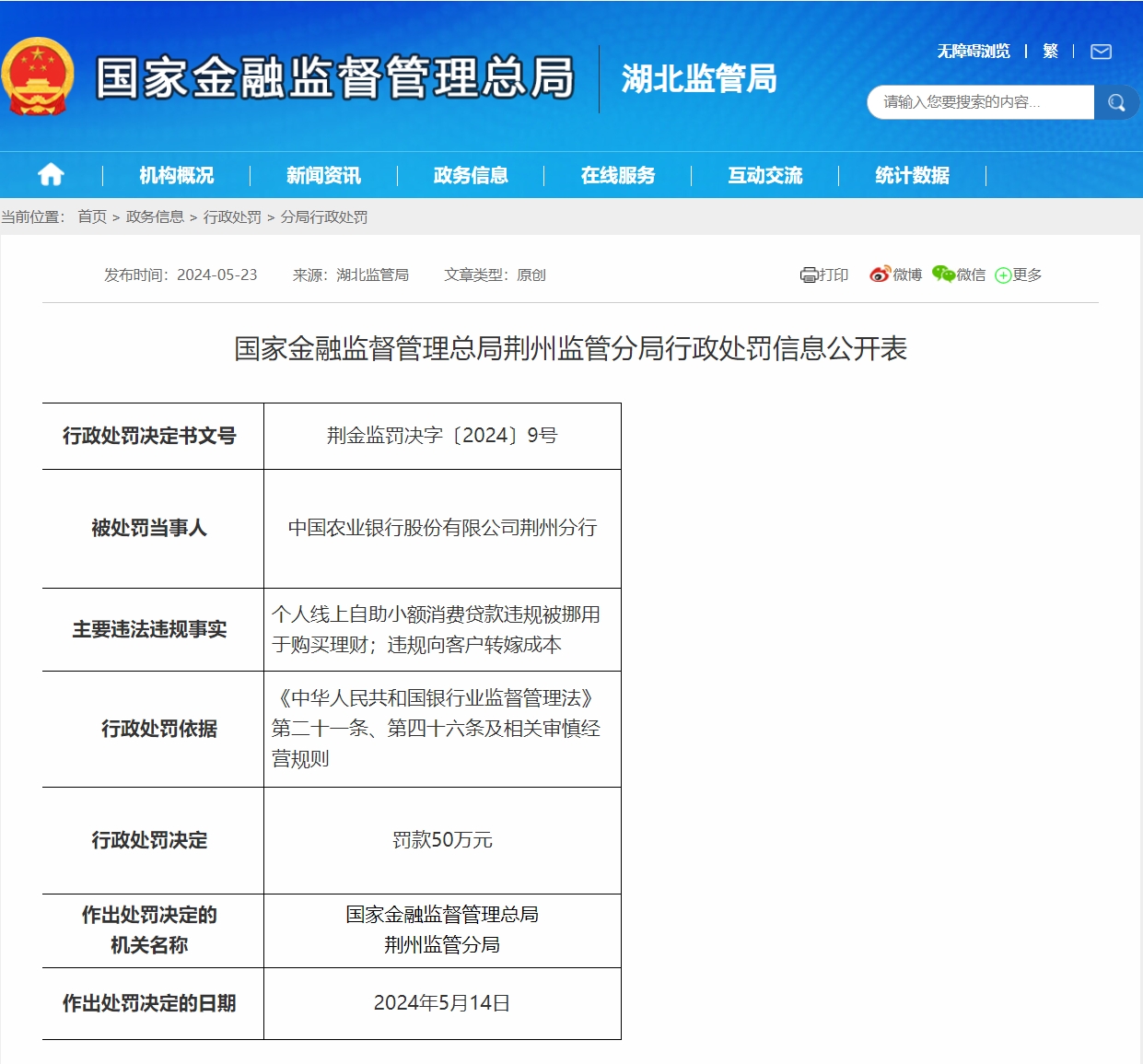 5月23日,渤海银行股份有限公司荆州分行因违规转嫁成本被罚款25万元;中国农业银行股份有限公司荆州分行因违规挪用个人线上自助小额消费贷款、违规向客户转嫁成本,被罚款50万元。